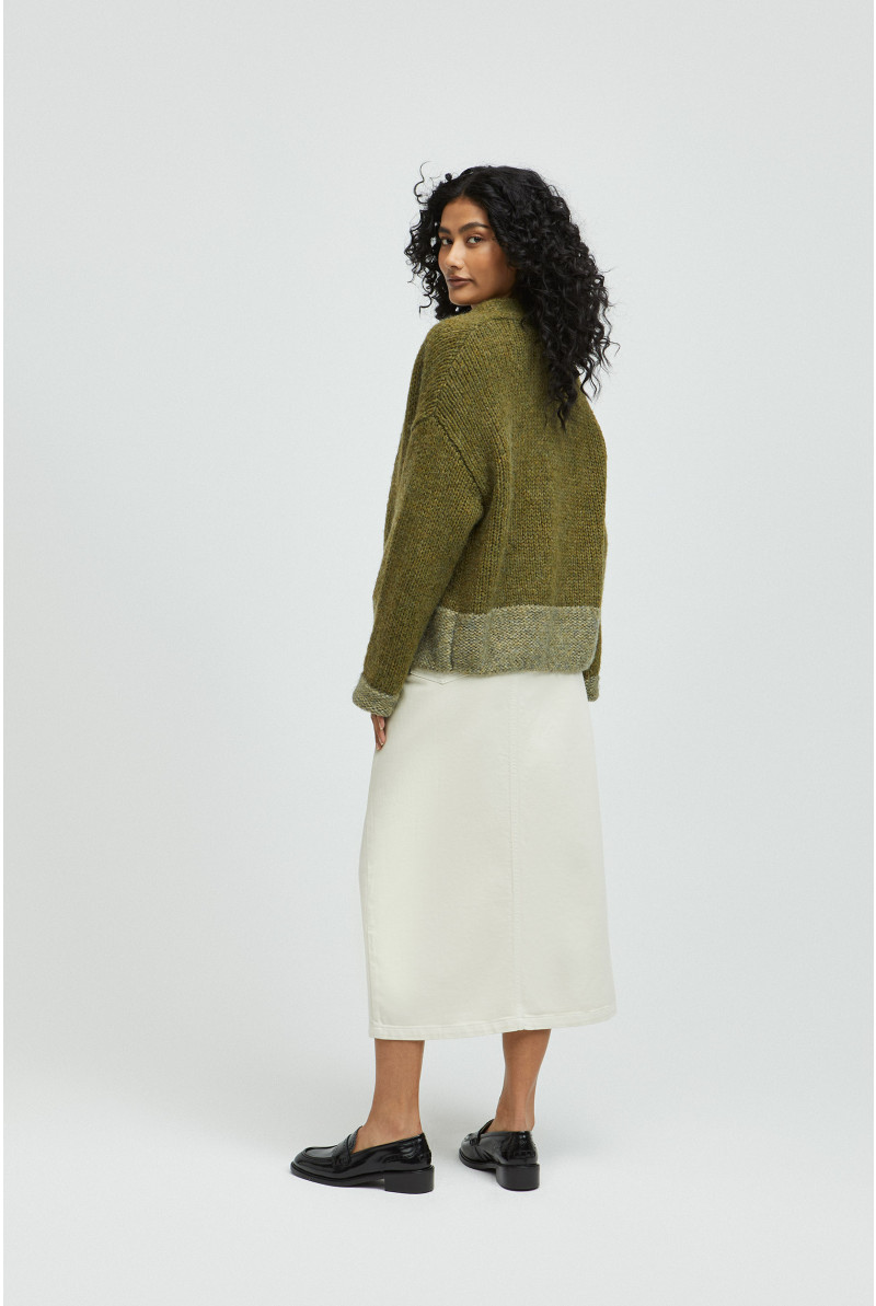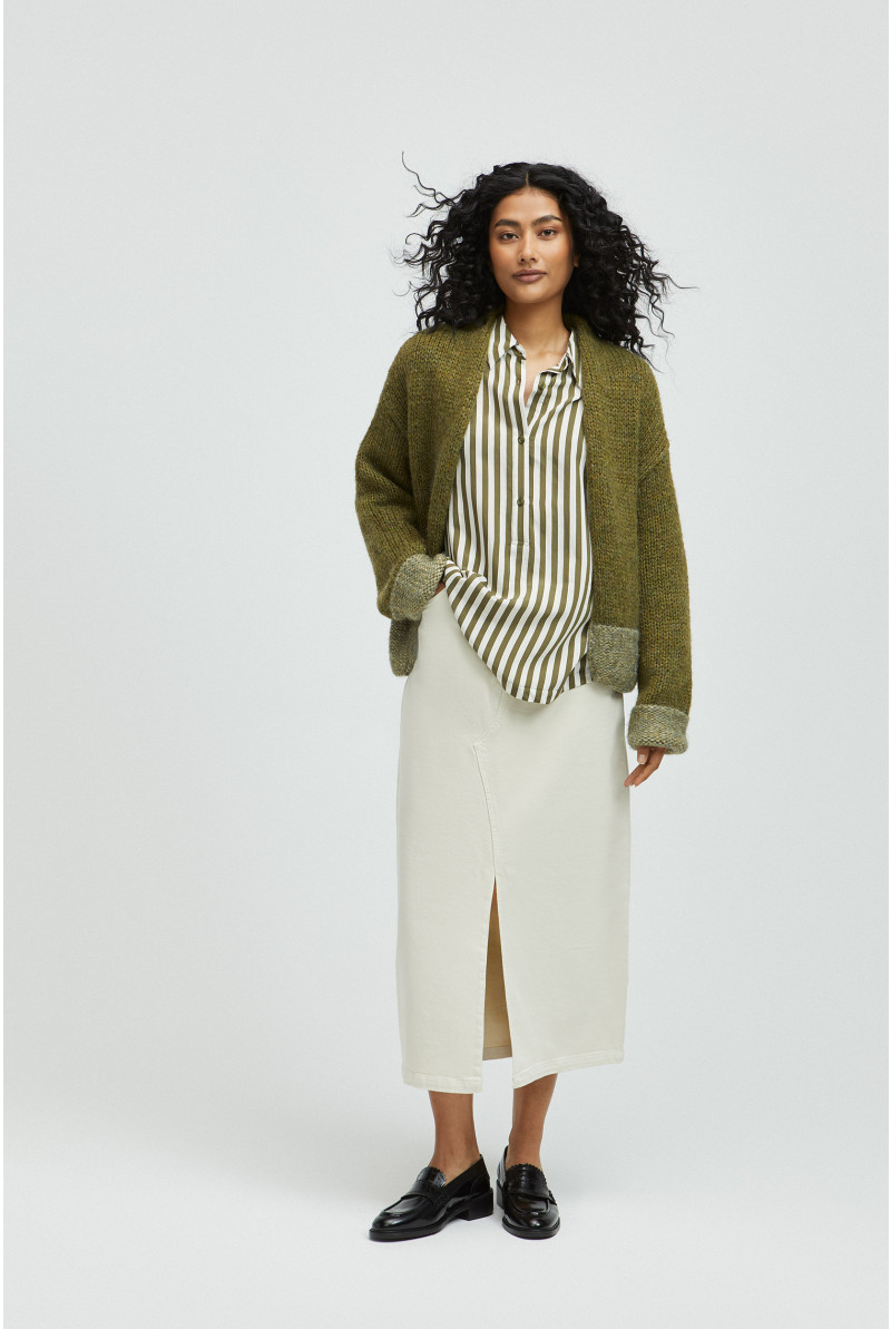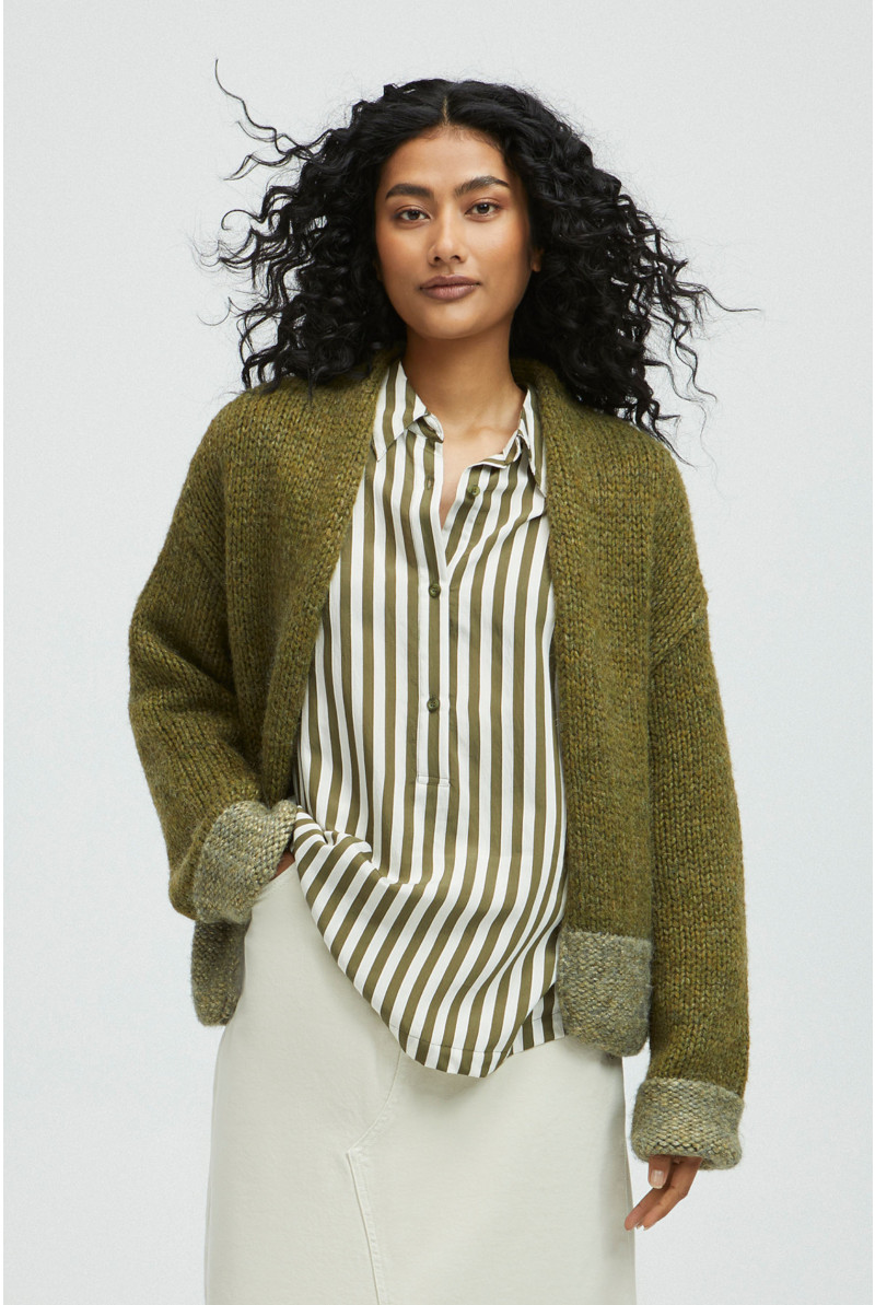 Een eenvoudige losgebreide gilet met wijde fit is eenvoudig te stylen. Door de lurex boorden krijgt deze gilet een stijlvolle look. Combineer met een geklede broek en sneaker voor casual chic outfit.