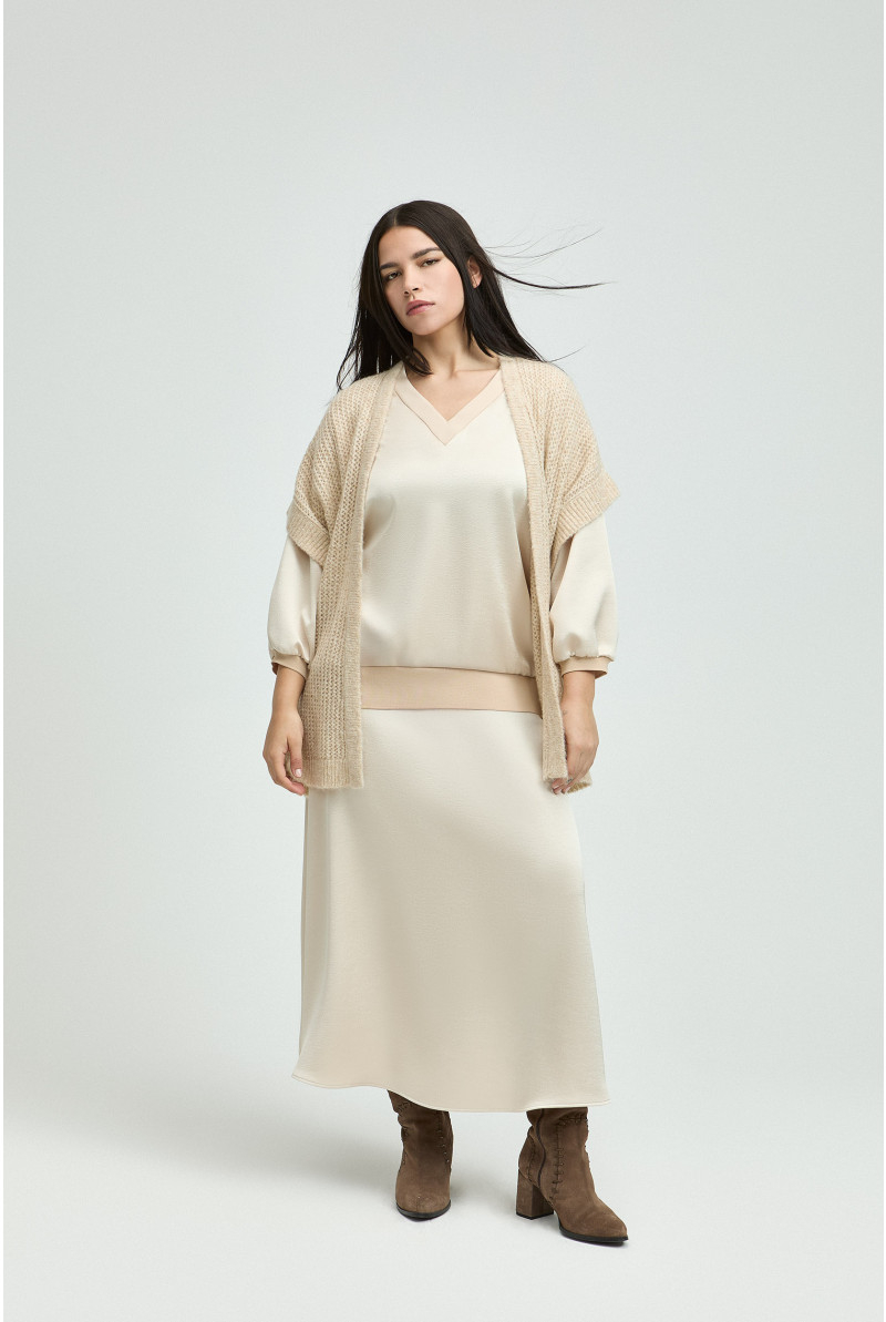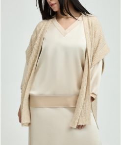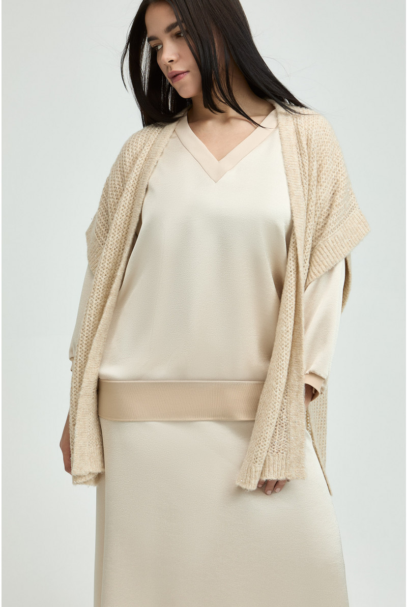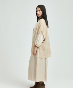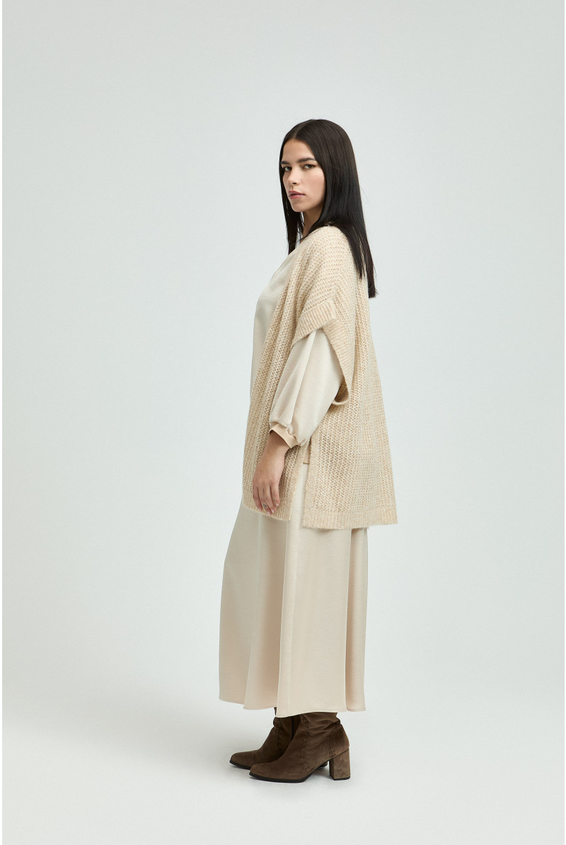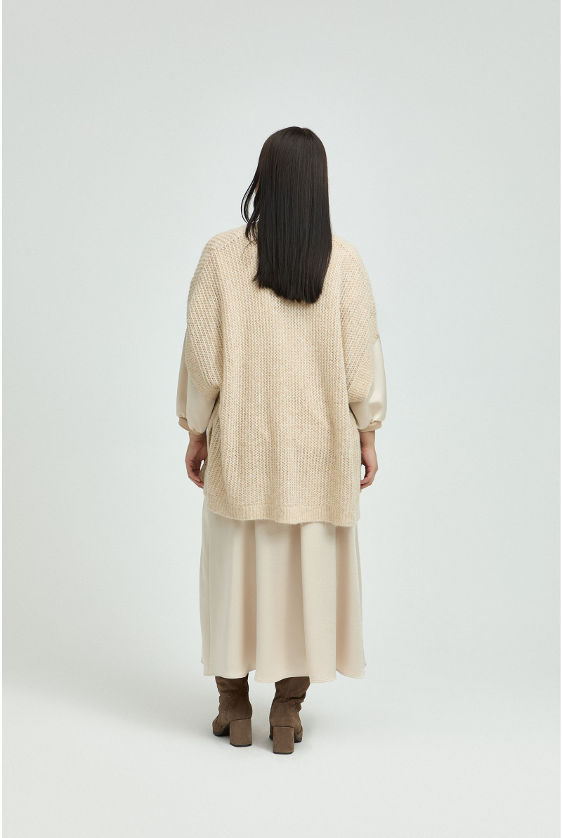 Deze gilet met korte mouwen leent zich perfect om te dragen over een blouse of t-shirt. De losse fit maakt de trui comfortabel en warm, perfect voor dit seizoen. De subtiele pailletten maken het plaatje compleet.