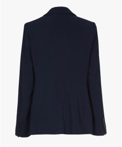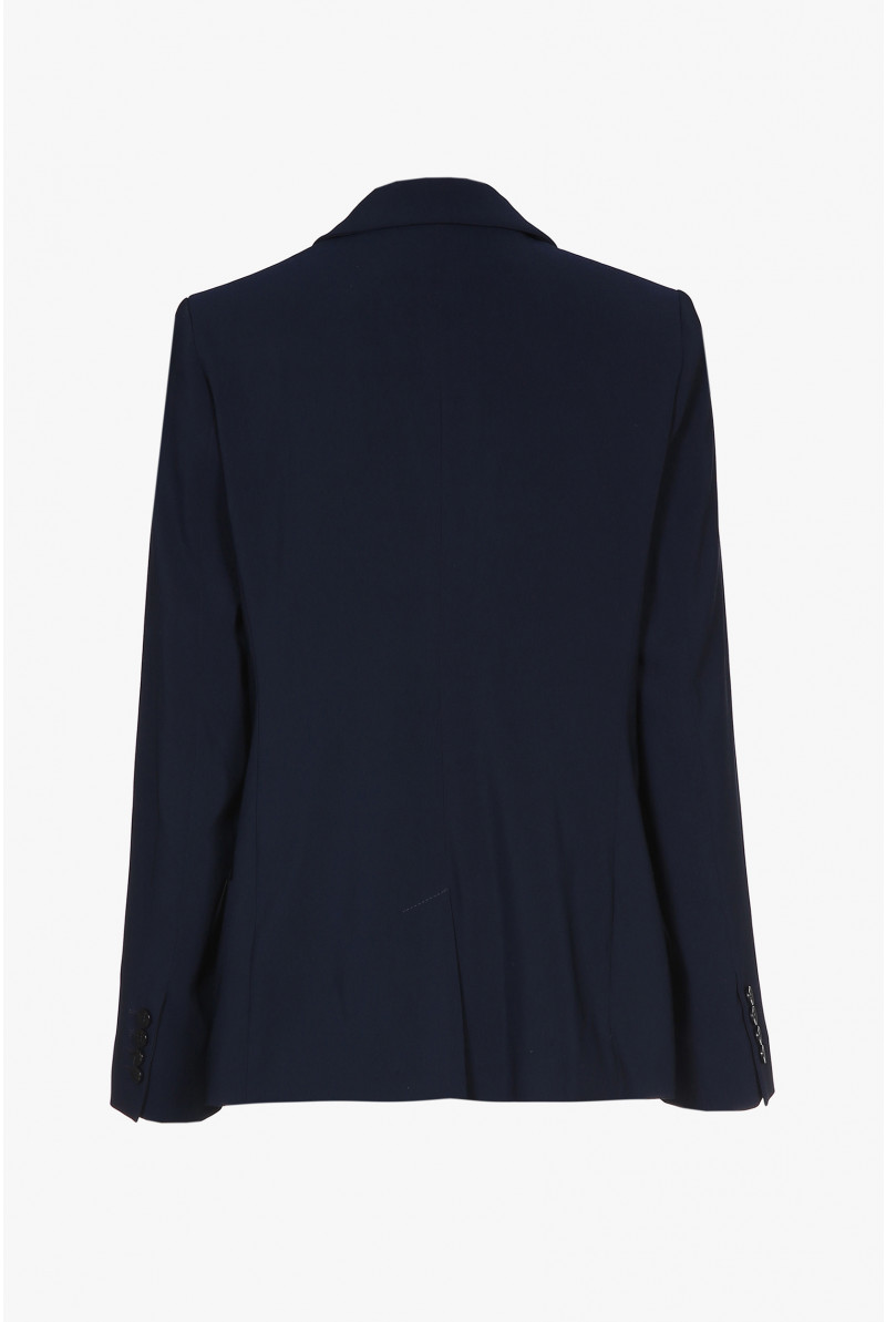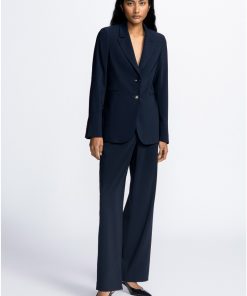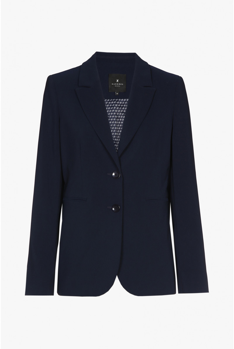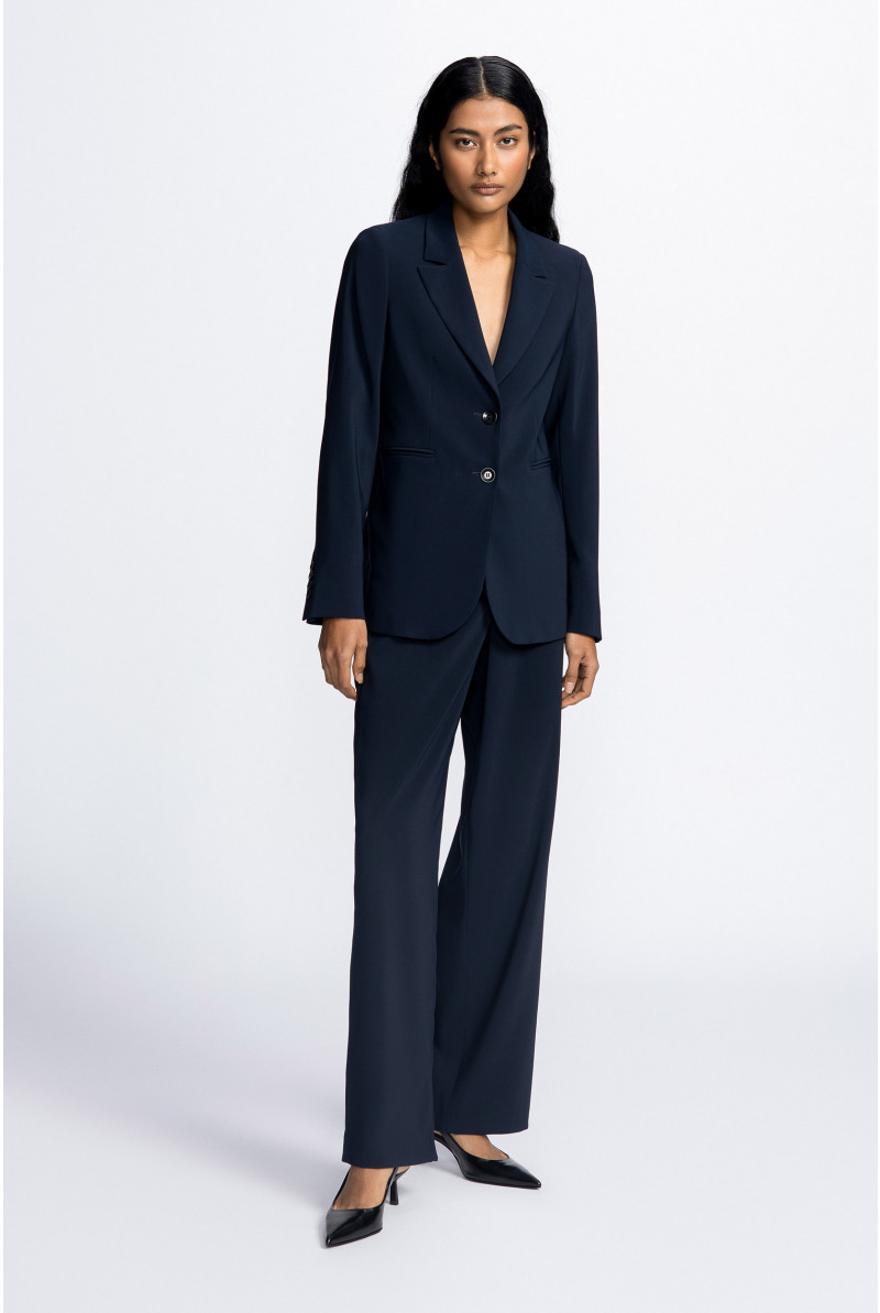 Vrouwelijke blazer met twee knopen en een afgeronde zoom met split op de rug. Dit langere model omvat de heupen. Gemaakt in een kreukvrije crêpe stretchstof.
