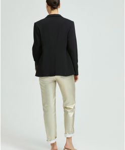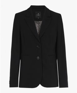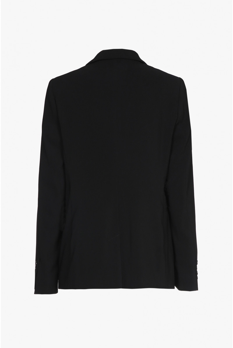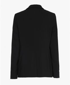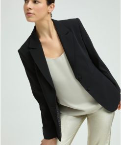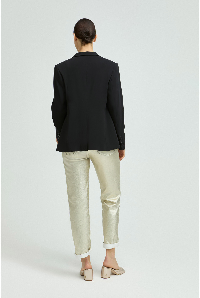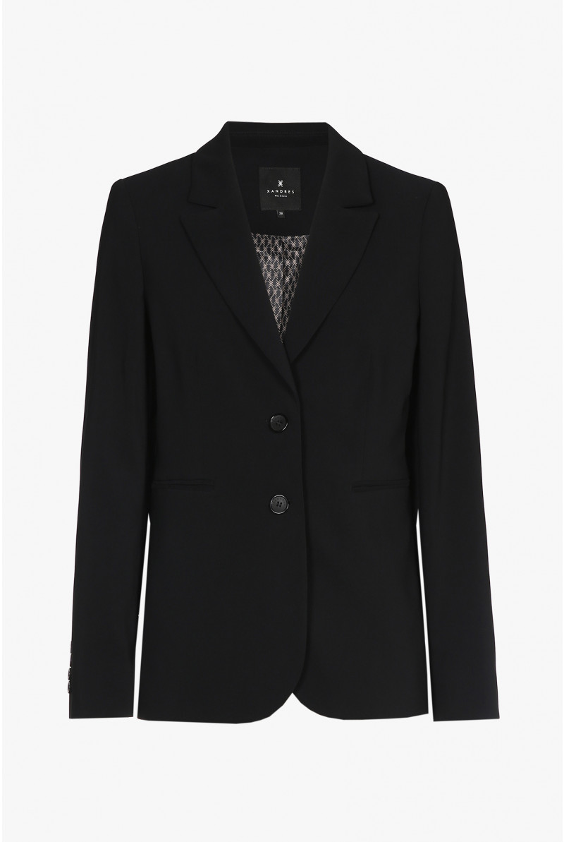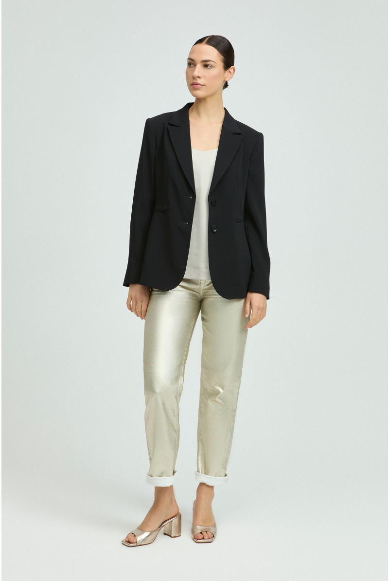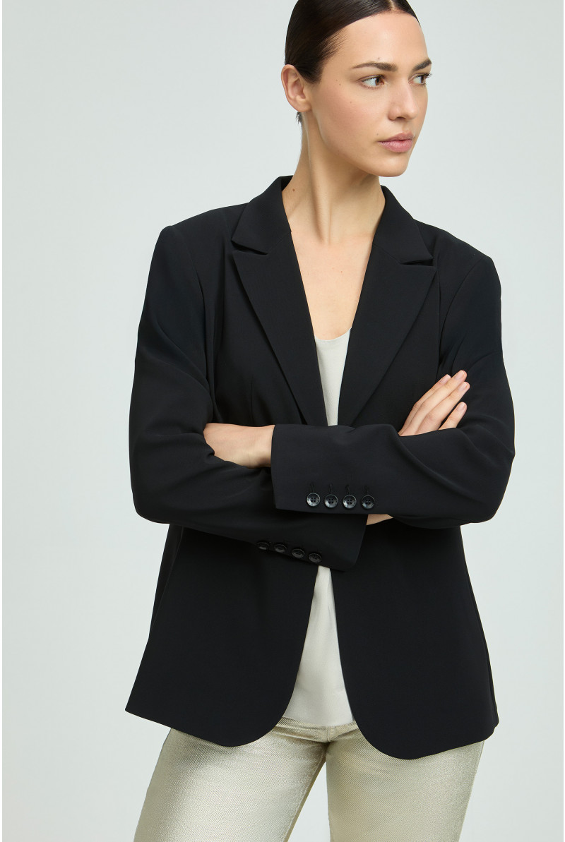 Vrouwelijke blazer met twee knopen en een afgeronde zoom met split op de rug. Dit langere model omvat de heupen. Gemaakt in een kreukvrije crêpe stretchstof.
